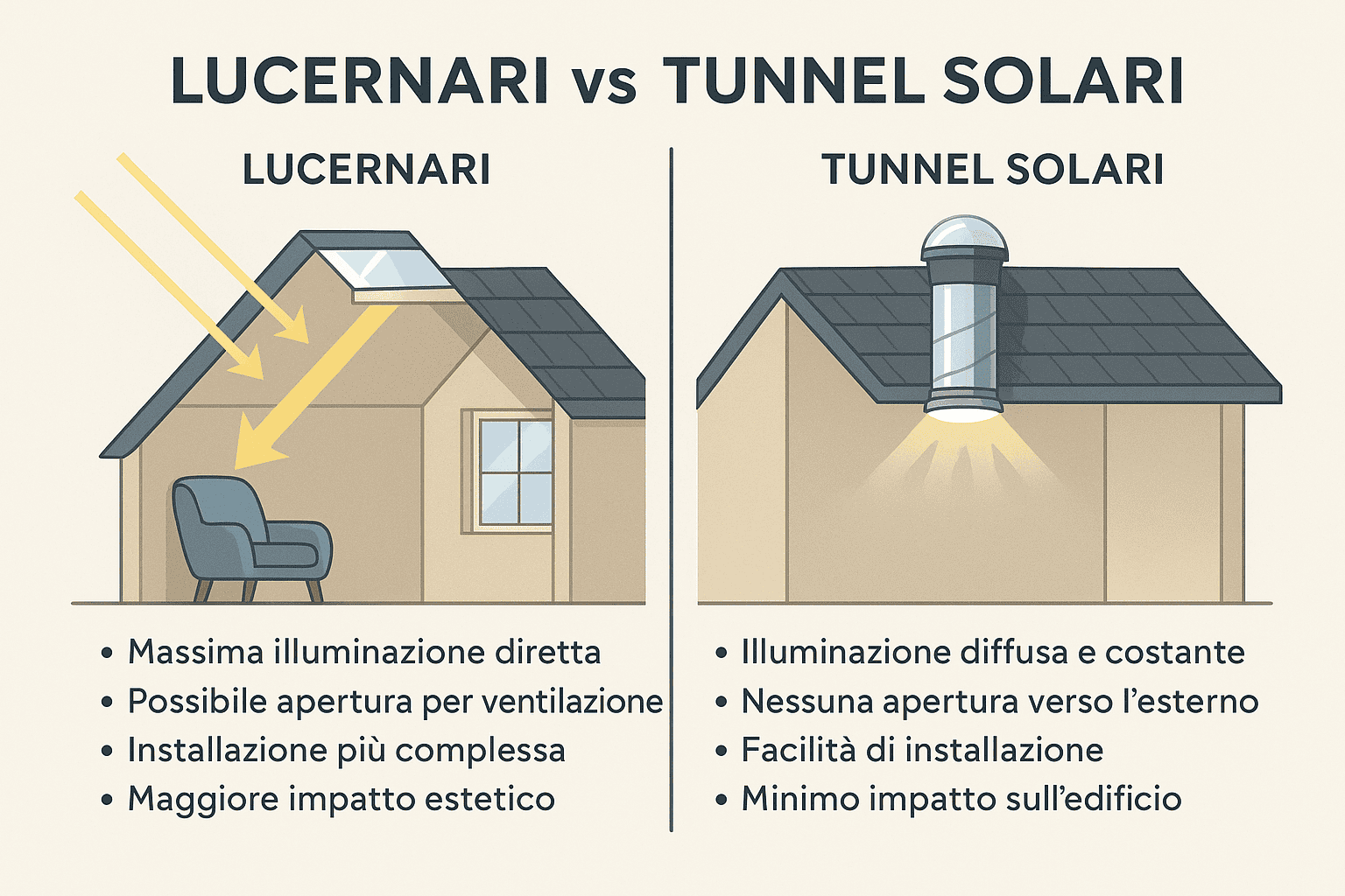 Per aiutare nella scelta tra lucernario e tunnel solare, è utile confrontare alcune caratteristiche chiave: